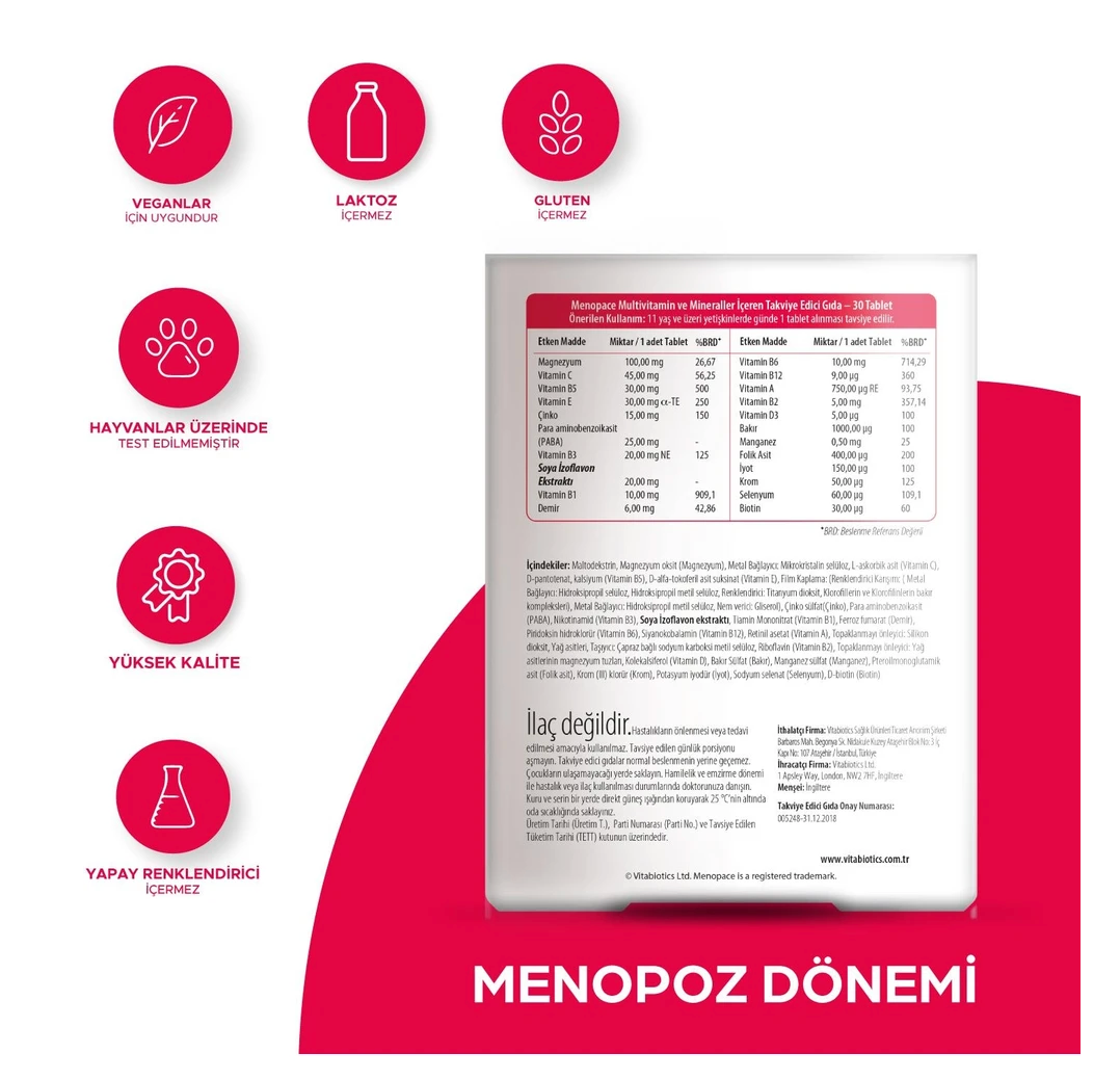 Menopace Original 30 Tablet, menopoz dönemindeki kadınların değişen besin ihtiyaçlarını desteklemek amacıyla özel olarak formüle edilmiş bir vitamin ve mineral takviyesidir. İçeriğinde yer alan vitaminler, mineraller ve bitkisel bileşenler; enerji seviyesinin korunmasına, bağışıklık sisteminin normal fonksiyonuna ve genel yaşam kalitesinin desteklenmesine yardımcı olur.
